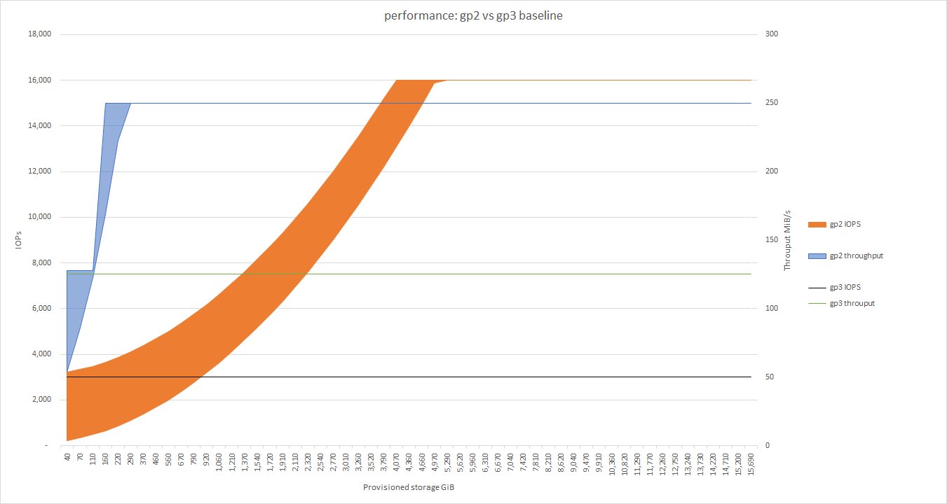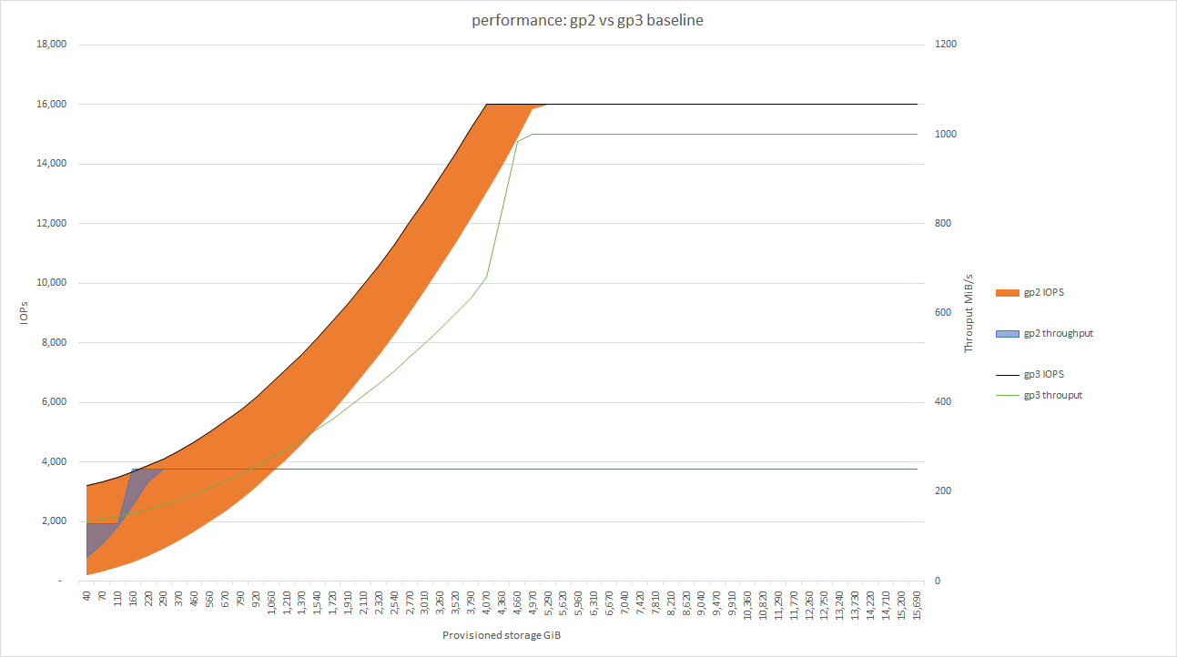 Gp2 volumes performance depends on the volume size. As shown in the following diagram, the gp2 volume maximum IOPs can be anywhere within the thick orange line, the same applies for the maximum throughput (the blue line). On the other hand, the gp3 performance is consistent.
