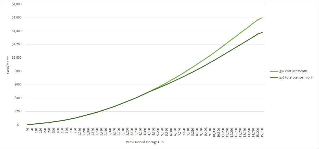 - Provisioned throughput: also a gp3 volume provides a baseline 125 MiB/s throughput free of charge. This can be increased up to $0.04/MB/s-month for provisioned throughput above the baseline.